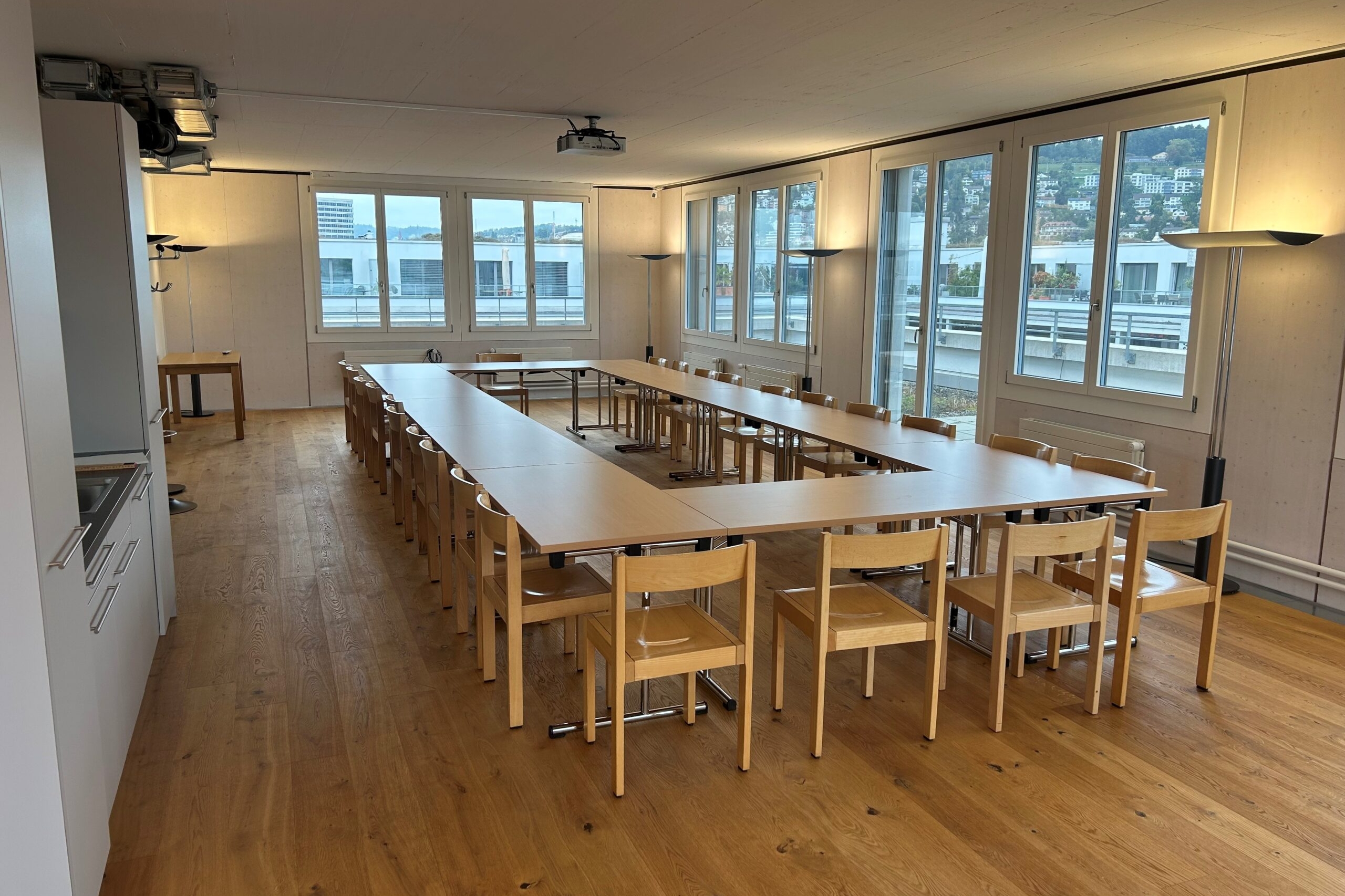 Ergänzt wird das Angebot durch vier helle Seminarräume à 43 m² im 1. OG sowie zwei weitere Mehrzweckräume mit Terrasse im 6. OG für 2-50 Personen.